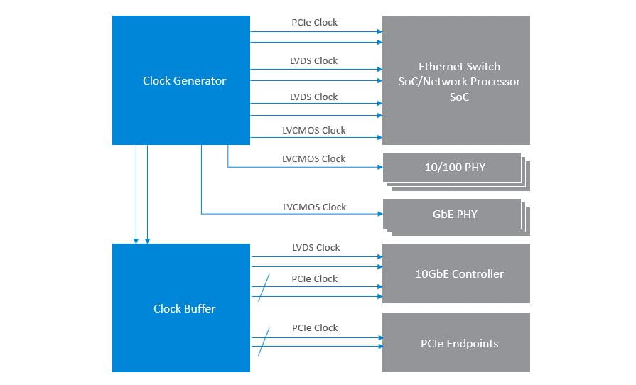 As Ethernet continues to proliferate throughout the vehicle, automotive networking gateways are adopting network processor platforms that offer higher bandwidth, and a greater number of ports. The latest generator of network processors use high-speed SerDes to support increased processing power, multi-interface support, and high-speed PCIe-Express data path interconnects, all of which require reference clocks with tighter jitter performance, both single-ended and differential output formats, and higher output clock frequencies.