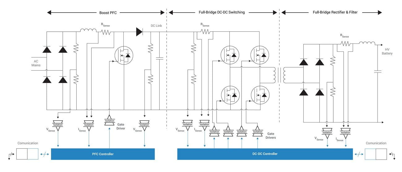 On-board charging systems take the AC input source, convert it to high voltage DC through the rectifier and provide Power Factor Correction (PFC). The resulting DC signal is chopped into a switched square wave, driving a transformer to create the required output DC voltage. The chopping of the input signal is accomplished using isolated gate drivers, such as Si8239x,