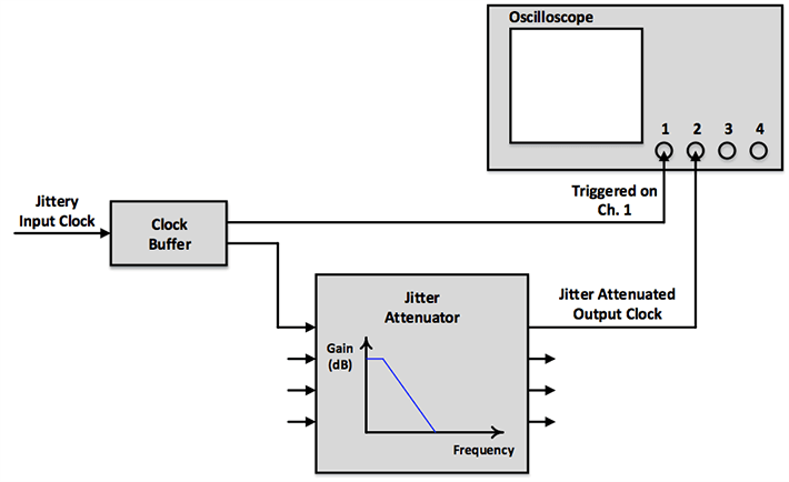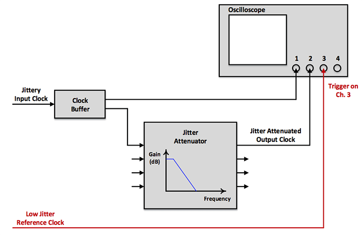 OK, so what's a better way to simultaneously compare the jittery input and jitter attenuated output clocks if all you have is a scope? Find a third party to arbitrate. In other words, find or generate a low jitter reference clock integer-related and synchronous to both the input and output clocks. Then use this reference as the trigger for both the input and output clocks. See the revised test set-up diagram in the figure below. Now you can clearly and fairly compare the jitter of the input and output clocks simultaneously in the time domain.