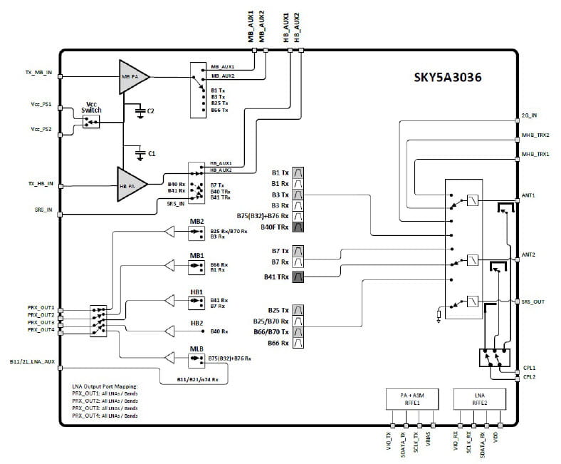 FEM for LTE Bands 1, 3, 25 (70), 66, 32, 7, 40, and 41.