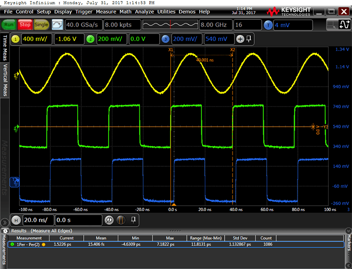 In the second instance, in the figure below, the jitter attenuator’s loop BW is 100 Hz and the output clock is much less jittery. In this particular example, the standard deviation of the jitter attenuated clock’s cycle to cycle jitter dropped from 8.2 ps to 1.1 ps when the loop BW was decreased from 4 kHz to 100 Hz.