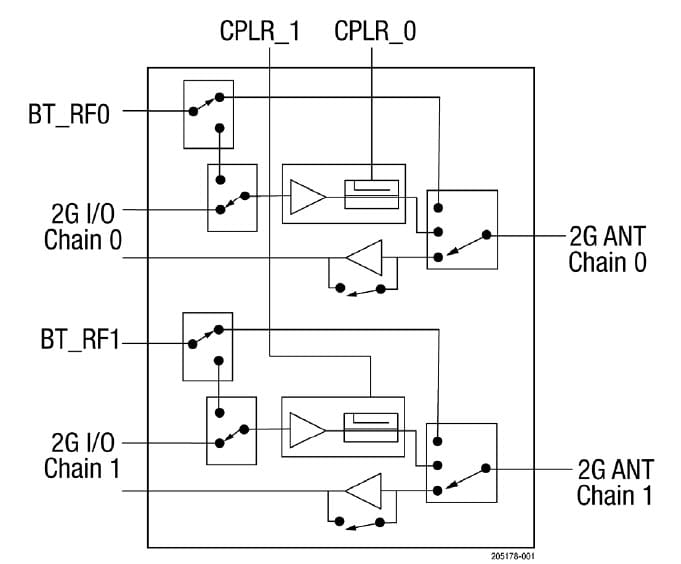 The SKY55242-11 includes a 2.4 GHz power amplifier (PA), a 2.4 GHz low noise amplifier (LNA) with bypass and a single-pole, triple-throw (SP3T) transmit/receive (T/R) switch. The compact module has two separate 2.4 GHz chains; each chain has a dedicated coupler and a port suitable for Bluetooth® signals.