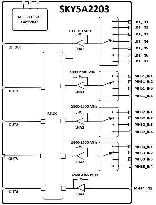 The SKY5A2203 is a complete LB/LMB/MHB LNA bank module that integrates high linearity, superior gain, and industry-leading noise figure (NF) performance. The SKY5A2203 is part of our Sky5® product portfolio.