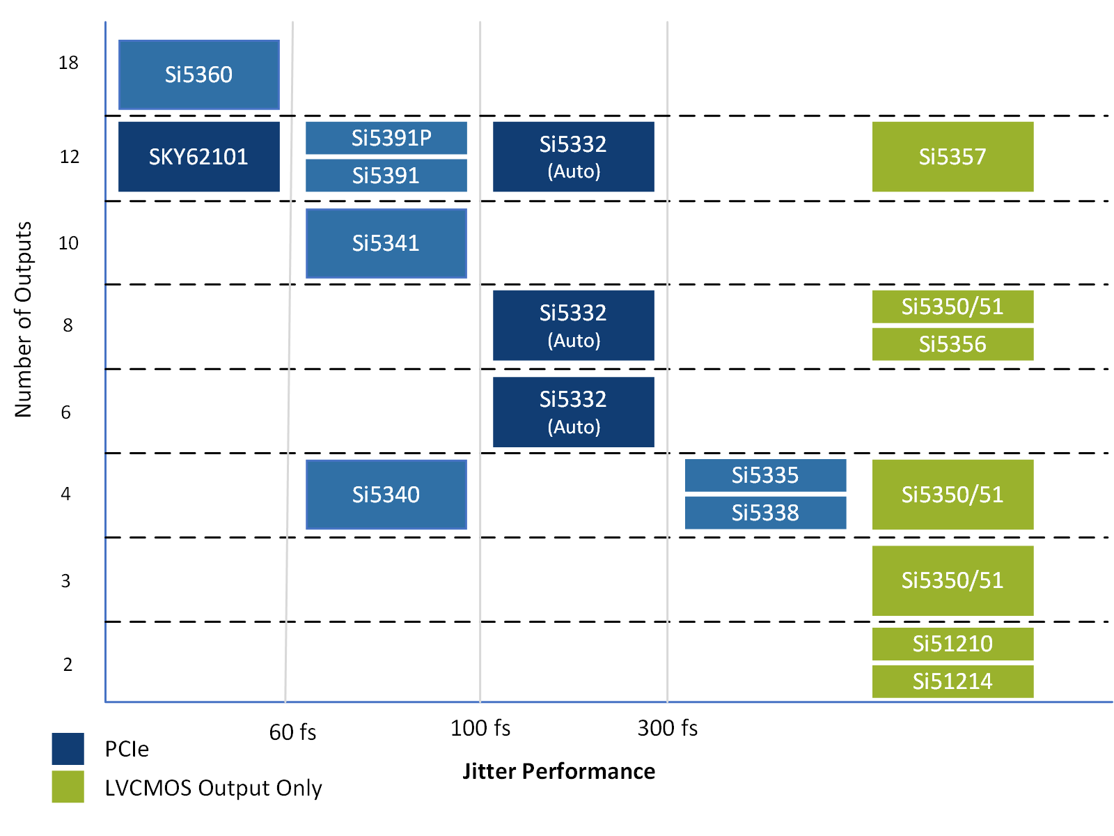 Our clock generators produce any combination of output frequencies from any input frequency, simplifying clock synthesis and minimizing the number of timing components needed. With industry-leading jitter performance and functional integration, the devices can be customized for any application. We also offer innovative PCI Express clocks (PCIe clocks) and LVCMOS clocks that simplify design and minimize power consumption in cost-sensitive applications.