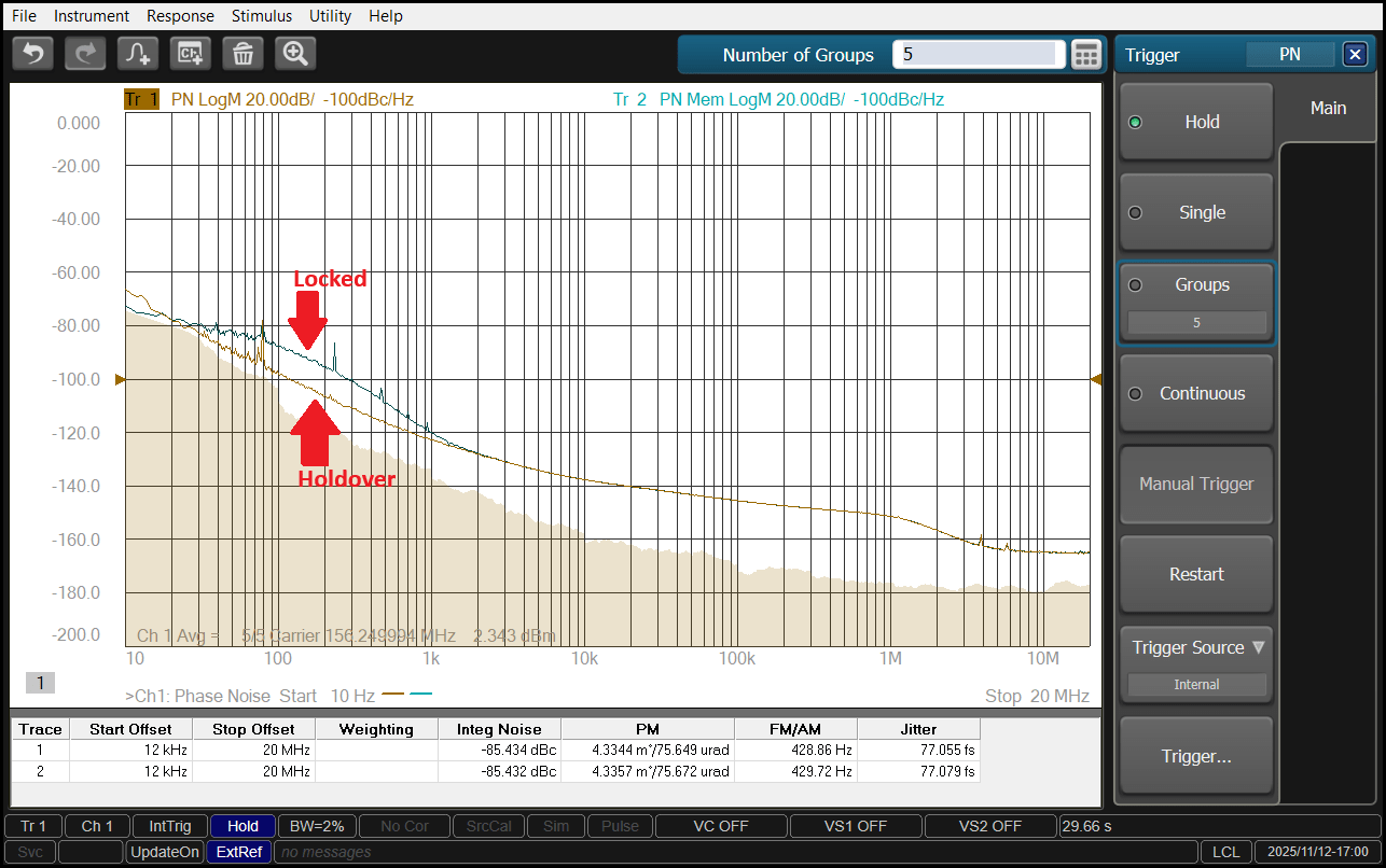 In the second example phase noise plot above, there is a data trace Tr1 for the Si5395 in HO and a memory trace Tr2 for the Si5395 when locked with BW = 4 kHz.