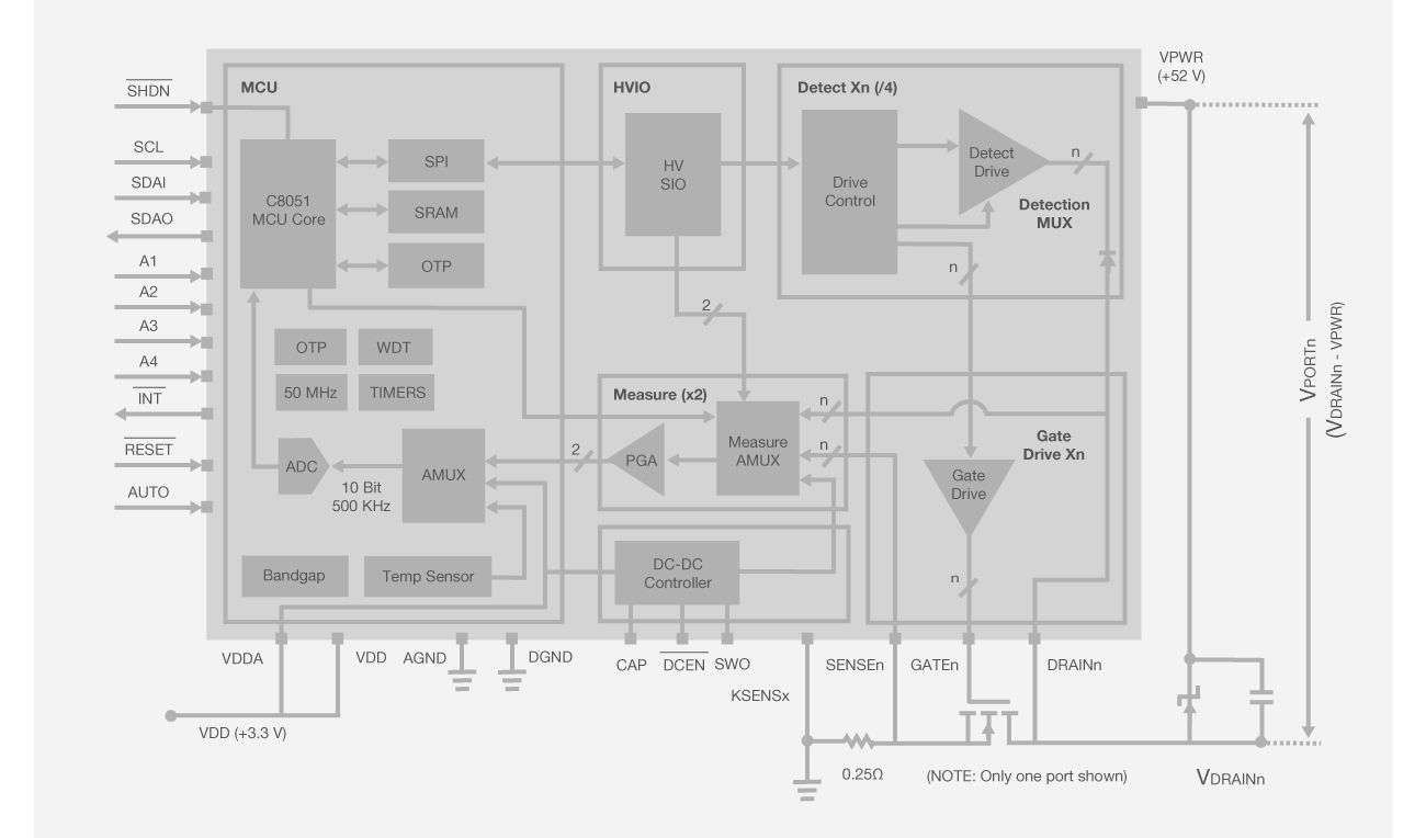 Si3474 powers up to four 802.3bt 4-pair Ethernet ports with 90 W per port and supports thermally efficient 200mΩ current sense resistors. It is fully backwards compatible with 30 W and 15 W devices. The new Si3472 powers up to four 802.3bt 2-pair Ethernet ports with up to 45 W per port. The new Si3473 powers up to eight 802.3bt 2-pair Ethernet ports with up to 45 W per port. All Skyworks multi-port PSE devices support autonomous or hosted operation, automatically detecting valid Powered Devices (PDs) and cutting off port power when connected PDs are removed. In addition, each PSE device provides a full featured I2C register interface for advanced power management and control.
