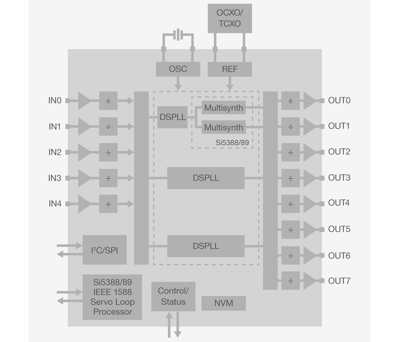 Our network synchronizer clocks lead the industry in jitter performance while offering low power consumption and are ideally suited for SyncE/SONET/SDH timing card and pizza box applications, as well as 5G wireless communication systems and data center switches. With up to three integrated DSPLL® devices and small package sizes, these devices reduce complexity and PCB footprint requirements for timing synchronization.