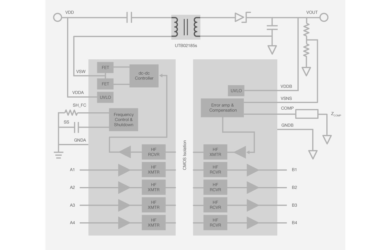 Si88xx devices have up to four high speed digital isolation channels integrated with a modified fly-back topology based dc-dc converter working in conjunction with an external transformer to provide up to 5 W of isolated power with a 24 V input supply. An external switch is used to supply the secondary side of the Si88xx, as well as other circuits on the isolated side with an isolated 5 V supply. The converter includes safety soft start, thermal detection, and cycle-by-cycle current limiting safety features, as well as built-in secondary sensing and feedback through the isolation barrier back to the controller, resulting in excellent line and load regulation for system stability.