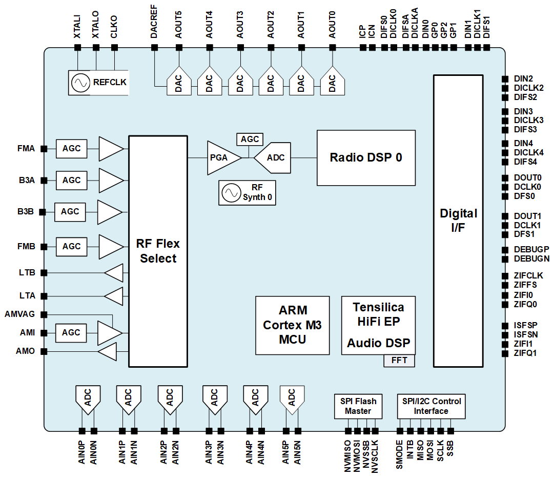 Si4798x devices are high-performance automotive AM/FM radio receivers and digital radio tuners with audio processing. The integrated audio processing sub-system provides a complete solution to synchronize, process, aggregate, and distribute digital and analog audio signals in the head-unit. The Si4798x devices include a set of audio software products and tools available for license, providing a complete solution for audio post-processing in the radio. The Si4798x devices are pin/package and API compatible with Si4797x devices, thus, enabling radio suppliers to scale designs from Low-end to High-end, covering all product segments.