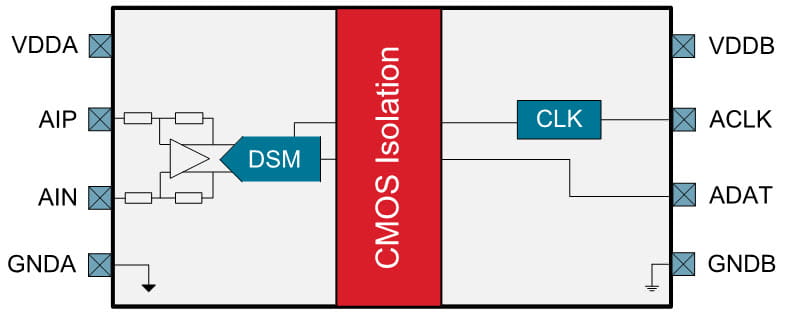 The Si894x is a galvanically isolated delta-sigma modulator which outputs a digital signal proportional to the voltage level at the input. The low-voltage differential input is ideal for current measurement using shunt resistors or for any place where a sensor must be isolated from the control system. Low noise, low error, and high precision ensure an accurate measurement of system current.